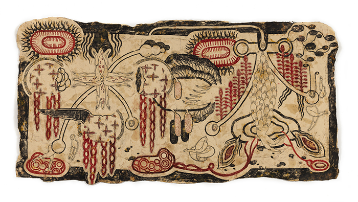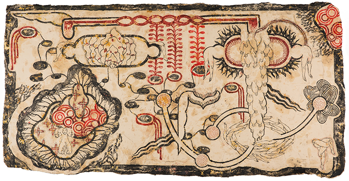 Ho avuto il piacere di conoscere un artista singolare, sia come individuo che come artista. Simone Pellegrini è un artista schivo e profondo, colto e selvaggio. Il suo lavoro è una costante ricerca del perché, analisi e domande costellano il suo animo. Ogni singola opera, a mio modesto parere, diviene una narrazione a se stante, ma indispensabile tassello per costruire l’intero lavoro nella sua pienezza e complessità. Esegue i suoi lavori su carta, oggetto anch’essa di varie lavorazioni. Guardando con attenzione il suo lavoro ho pensato ai graffiti lasciati dai primitivi nelle loro caverne, primi segni grafici e se vogliamo di arte, per lasciare testimonianza di se e del loro passaggio, utile a noi posteri per ricostruire l’intera fase storica e testimonianza da dove veniamo. Dal tratto deciso e passionario, Pellegrini stampa su carta le sue emozioni e il suo sapere, abbattendo la temporalità della narrazione.